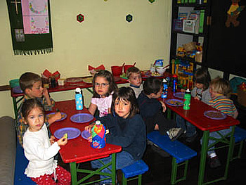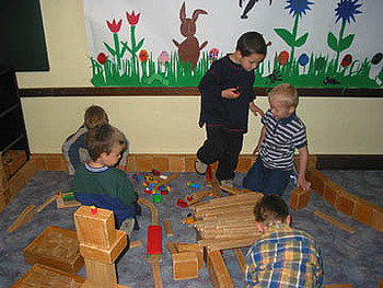 Die Kinder haben hier die Möglichkeit erste soziale Kontakte zu knüpfen, positive oder negative Eindrücke zu verarbeiten (z.B. im Rollenspiel), sich kreativ zu entfalten und von 9.30 - 10.00 Uhr mit ihren Freunden im Hof zu spielen. Nach dieser Freispielphase werden von den Erzieherinnen gezielte Angebote durchgeführt (z.B. Anschauen von Bilderbüchern, erlernen und vertiefen von Liedern, Fingerspiele, Kreisspiele, Tänze etc.), bevor um die Mittagszeit ein gemeinsames Essen stattfindet. Über die Angebote in den Gruppen hinaus finden regelmäßig gruppenübergreifende Angebote statt.